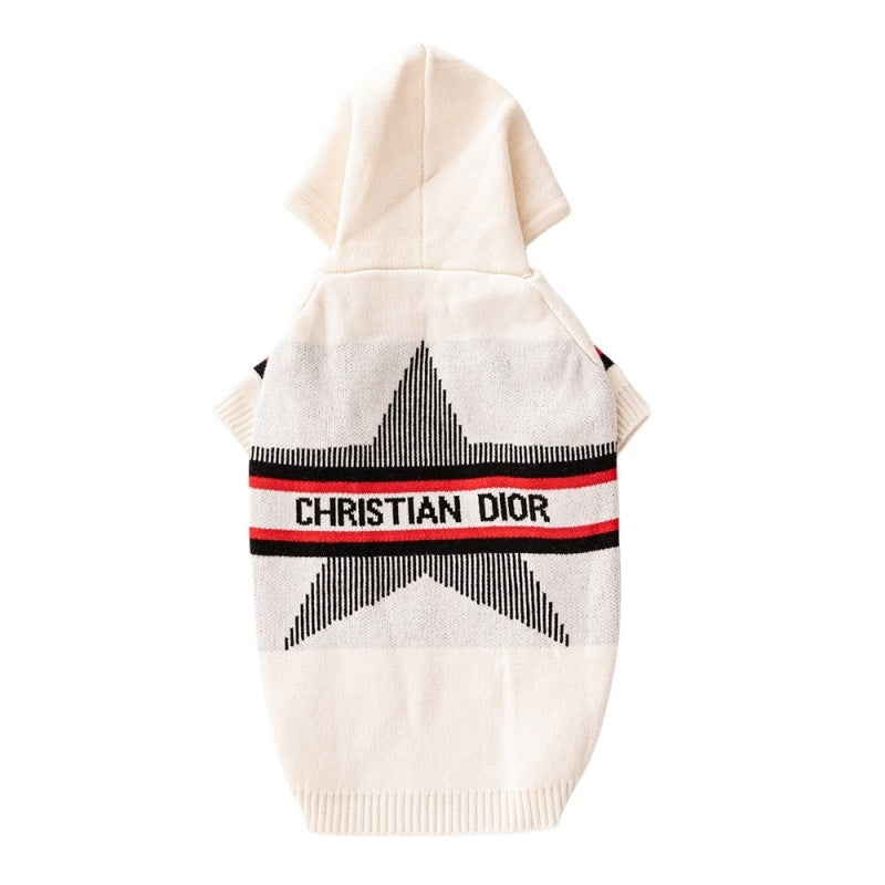 The hoodie makes a powerful statement with a bold black star graphic on the back, intricately detailed with red and black stripes bearing the legendary "CHRISTIAN DIOR" branding. Choose from two versatile colorways: pristine White for a crisp, high-contrast look, or sophisticated Grey for a more subdued, modern vibe. This isn't just pet apparel; it's a wearable emblem of luxury and cool.